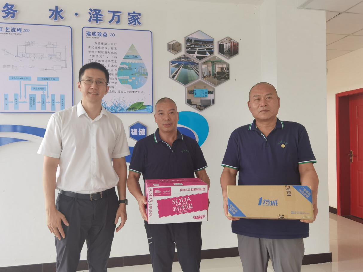 在万源公司驮山水厂,严总深切慰问了坚守一线的干部职工,并为他们送上了防暑降温慰问品。严斯亮询问了一线员工近期的工作和生活情况,并要求万源公司要重点关注一线岗位人员的身体健康,从上至下重视安全生产和防暑降温的必要性,做好后勤服务保障工作,确保所有人员安全度夏。同时,对万源公司干部职工在高温下坚守岗位,奉献担当的精神给予了肯定,并叮嘱他们做好防暑降温,以良好的精神状态投入到企业生产经营中去。