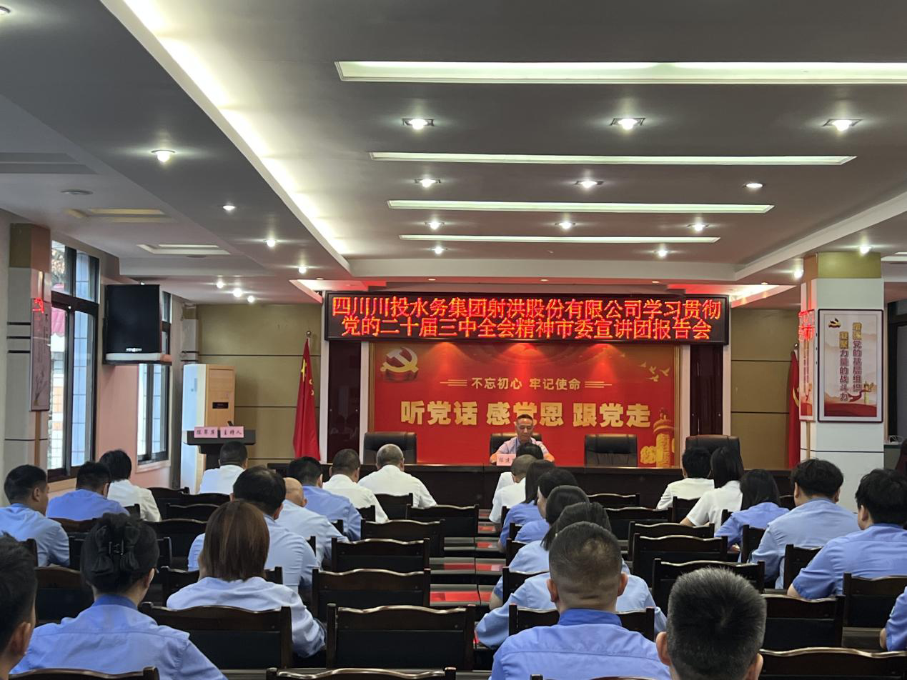 9月13日,点点体育在线登录入口射洪公司举行学习贯彻党的二十届三中全会精神市委宣讲团报告会。遂宁市劳动模范、射洪市委宣讲团劳模工匠宣讲分团成员、公司制水调度班班长陈建峰同志作宣讲报告,射洪市总工会代表、公司领导班子、全体党员、职工代表共计50余人参加了会议。