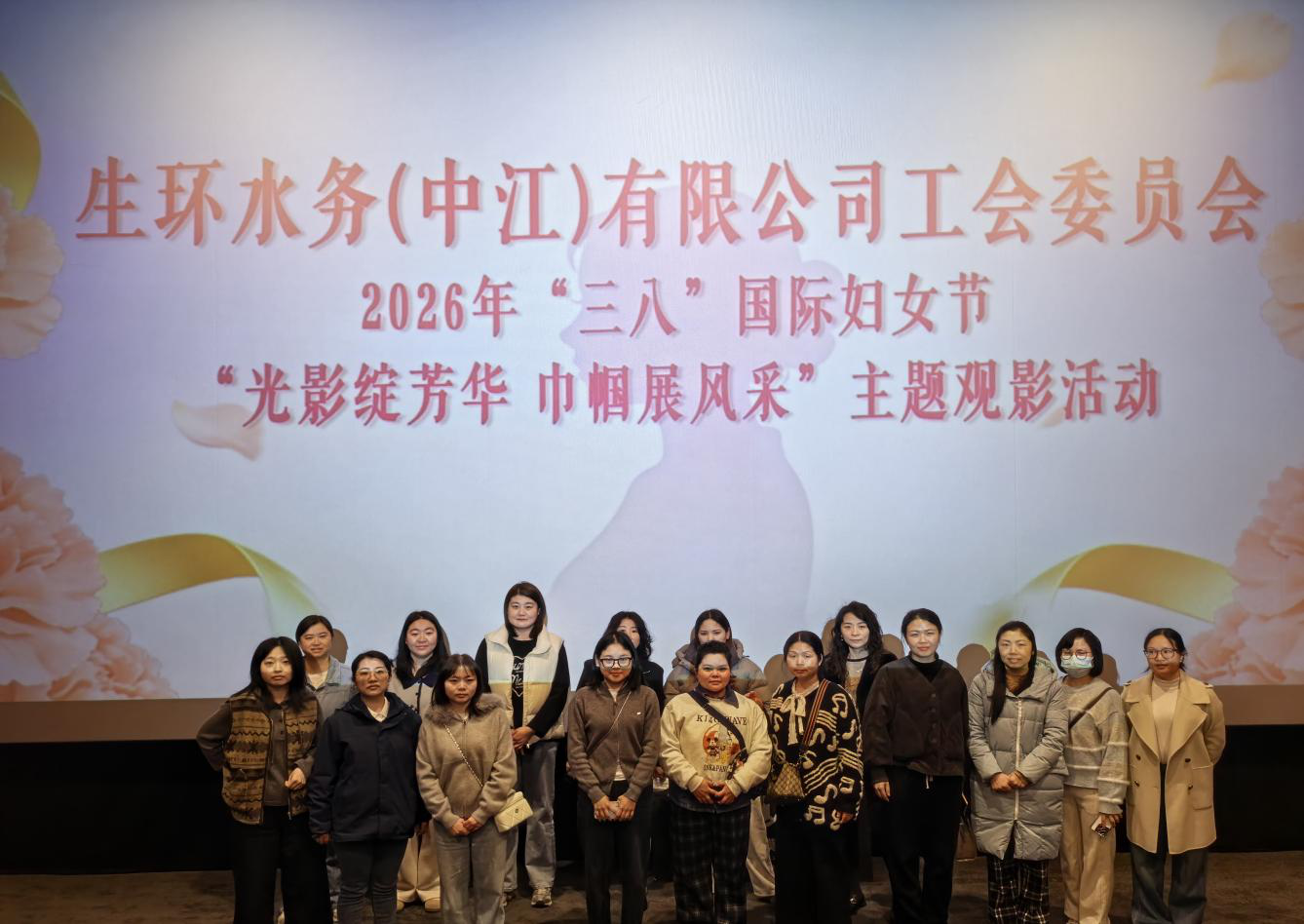 三月春风暖,巾帼绽芳华。在2026年“三八”国际劳动妇女节来临之际,为丰富公司女职工精神文化生活,营造尊重关爱女职工、温馨和谐的良好氛围。近日,中江公司工会委员会精心策划、周密部署,组织开展“光影绽芳华 巾帼展风采”主题观影活动,为全体女职工送上温馨的节日问候与美好祝福。