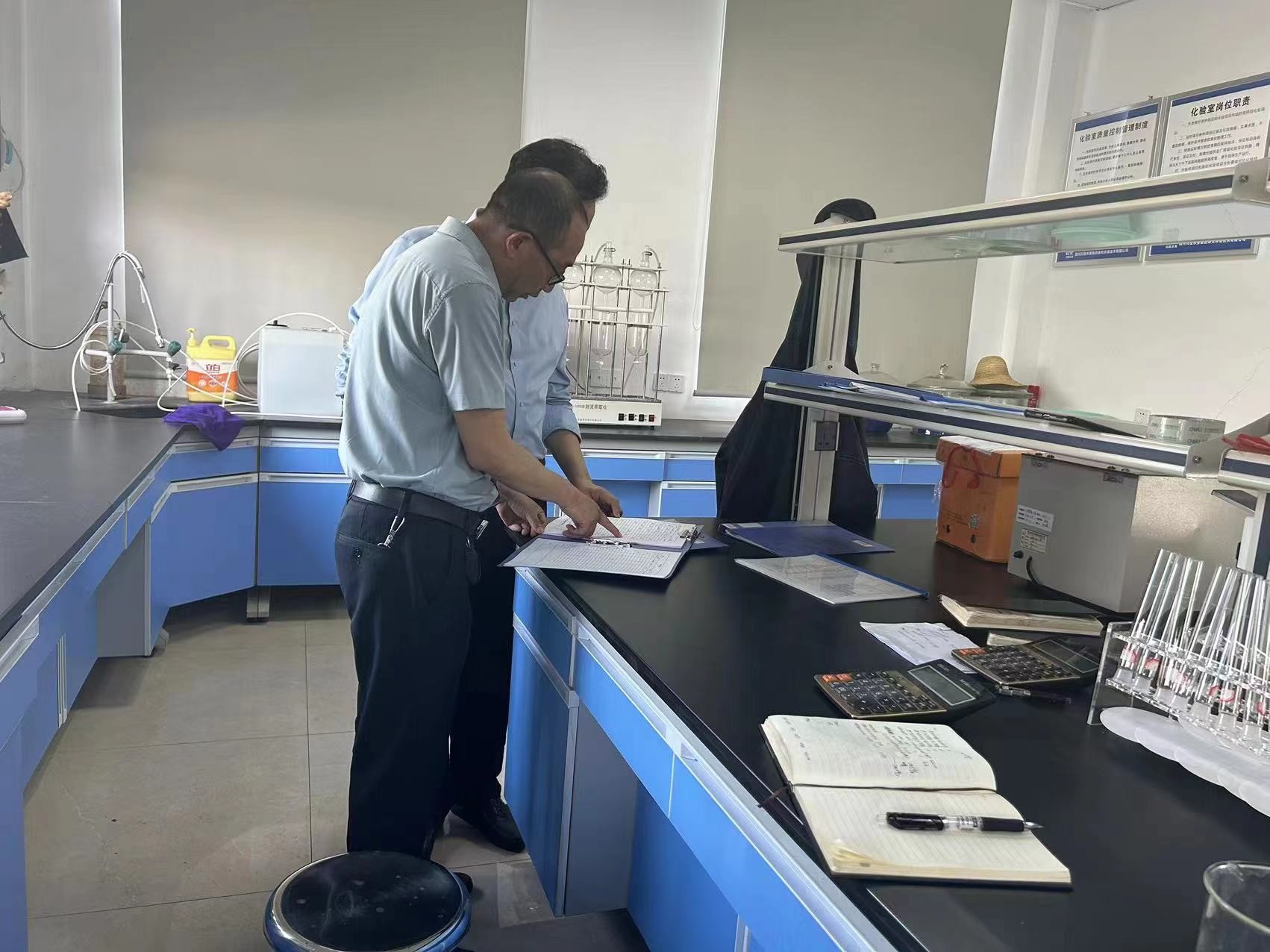 督导组首先到综合部向值班人员询问了节假日期间公司值班值守情况,在中控时查看了生产运行情况,随后查看了化验室危化品领用及使用记录,并询问了每日检测项目及检测结果,最后实地查看了膜池化学清洗情况、剩余污泥脱水情况、生产设施设备运行等情况。