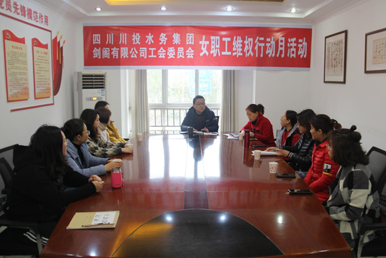 2019年3月21日,剑阁水司工会主席、副总经理韩名泉带领工会委员白桥及公司10余名女职工在下寺会议室,开展了以“贯彻落实男女平等基本国策,促进工作场所性别平等”为主题的女职工维权行动月活动,着力推动解决女职工在劳动就业、生育保护、职业待遇等促进工作场所性别平等存在的突出问题,依法维护女职工合法权益和特殊利益。