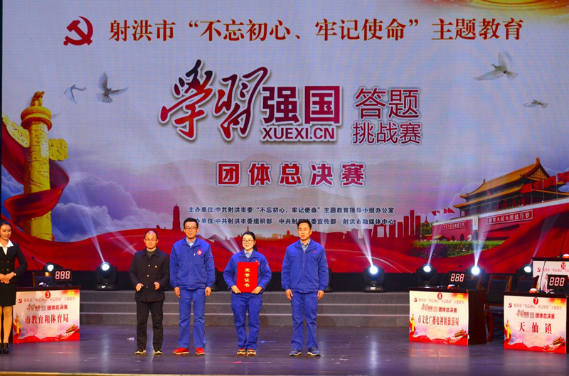 2019年12月31日下午3:30分,由射洪市委“不忘初心、牢记使命”主题教育领导小组办公室主办,射洪市委组织部、射洪市委宣传部、射洪市融媒体中心承办的射洪市“不忘初心、牢记使命”主题教育“学习强国”答题挑战赛团体总决赛在市文化艺术中心举行。遂宁市委宣传部副部长、市网信办主任蒋世兴及遂宁市主题教育第三指导组、遂宁市党员教育中心相关负责人等出席活动,射洪市各镇、街道、市直各部门代表参加并观看了比赛。