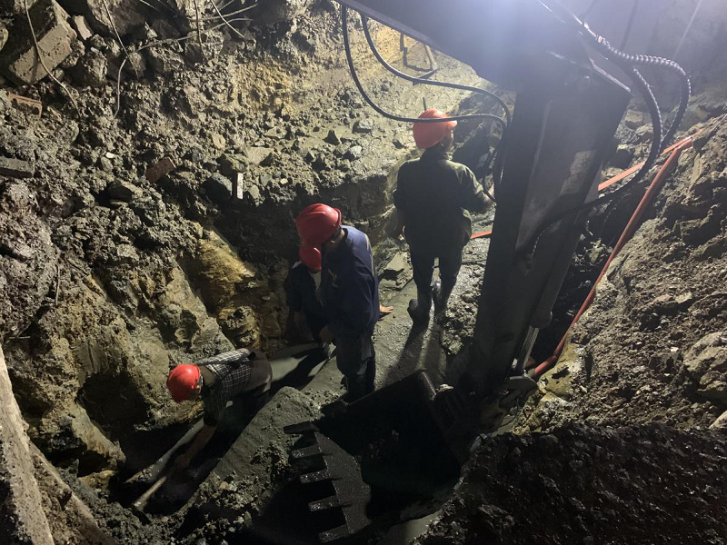 现场立即安排人员前往库房调取专用抢修物资——8月定制的DN800球墨铸铁抢修节。又因取水主管底部及周边被完整岩石包裹,机械开挖无法继续,作业方式紧急转为人工开挖,6名作业人员在狭窄空间内佝偻身体,持续挖掘直至晚上10时30分,终于开辟出合格作业面。随后,施工人员用机械将抢修节运送至作业点,反复调整角度确保与管道精准匹配,最终在10月22日凌晨2时21分完成全部抢修作业。
